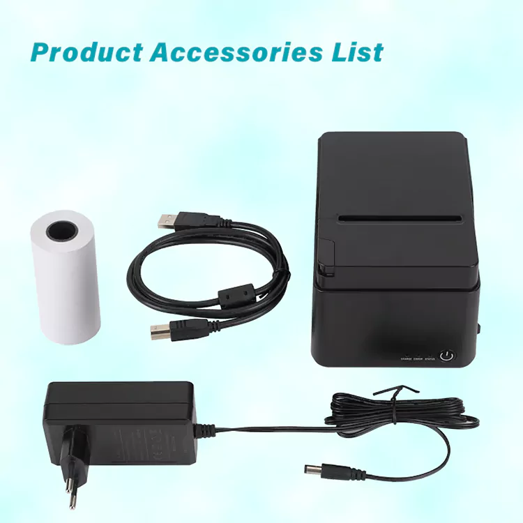 1.パッケージ内容: 80mm レシートプリンター、ロール紙、USB ケーブル、マニュアル、アダプター。